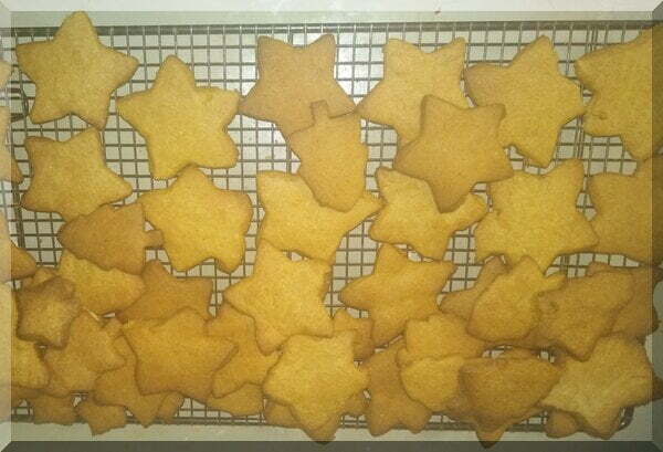 Pepparkakor biscuits (star and Christmas tree shapes) on a baking tray