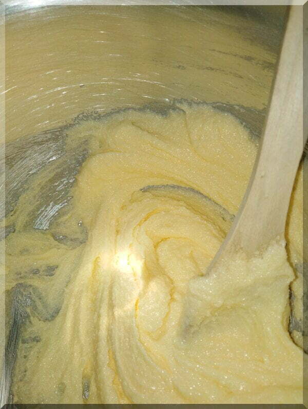 Cream the butter sugar (that means mix it thoroughly until it is a light yellow colour).