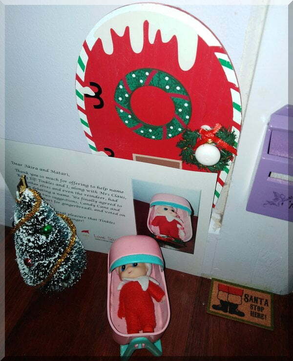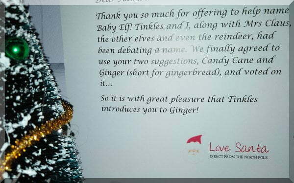 If you can’t read that, the note says “Dear kids, thank you so much for offering to help name Baby Elf! Tinkles and I, along with Mrs Claus, the other elves and even the reindeer, had been debating a name. We finally agreed to use your two suggestions, Candy Cane ad Ginger (short for gingerbread), and voted on it…