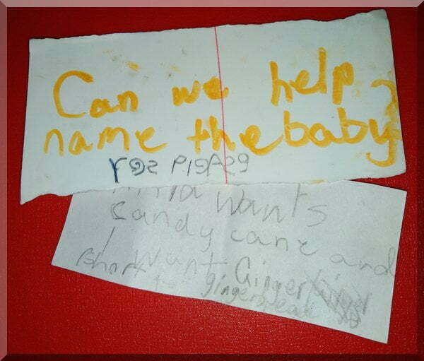 Then my daughter decided she should really have a name and began choosing names. After some thought, she asked Santa and Tinkles if she could help give the baby a name…